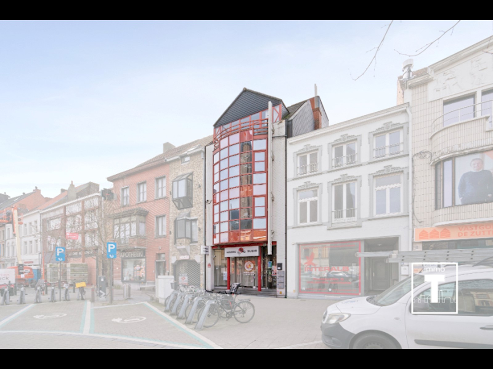 De gelijkvloerse verdieping biedt huidig plaats voor een sushi restaurant, met terras en sanitaire voorzieningen (toiletten). De 2 ruime appartementen (71m² en 82m²) op het eerste en tweede verdiep bestaan elk uit een inkomhal, een lichtrijke living en een open keuken, 2 slaapkamers, een badkamer en een apart toilet. Elk appartement heeft zijn eigen terras aan de achterzijde van het gebouw.