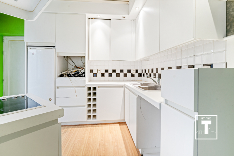 Het duplex-appartement beschikt over een aparte inkom. Op de eerste verdieping vindt u een ruime leefruimte met open keuken. De badkamer is uitgerust met een ligbad, douche en toilet. Ook het woongedeelte vergt renovatie, maar biedt een mooie basis voor wie een woning naar eigen stijl wil creëren.